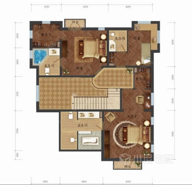 延續(xù)客廳的古典紅木色,加藍色為配色。