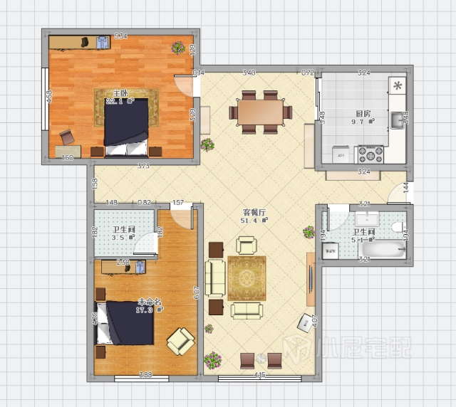 選用湖藍和明黃兩種裝飾色點綴空間,色彩感強,明亮鮮艷,適合年輕的群體。整體設計輕硬裝重軟裝,大量選用定制家具,更好的利用空間,個性化定制。